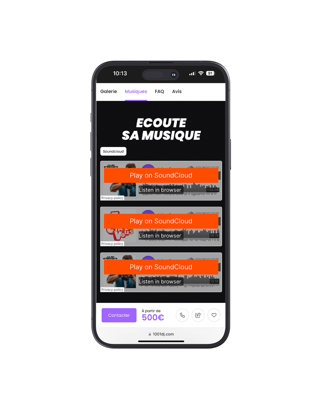 Intégrez facilement vos morceaux via Spotify, SoundCloud ou Deezer pour permettre aux clients d’écouter votre univers musical.