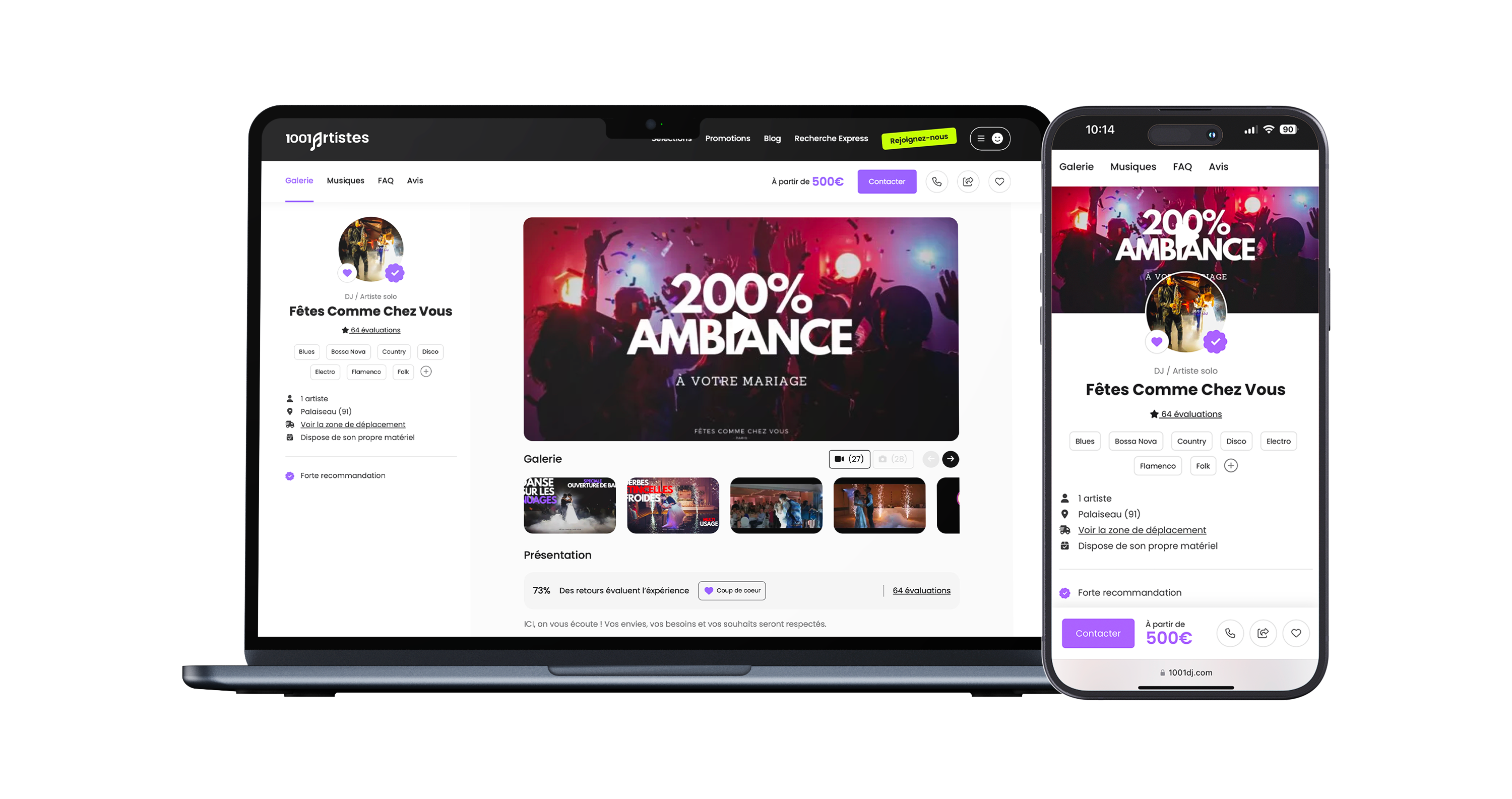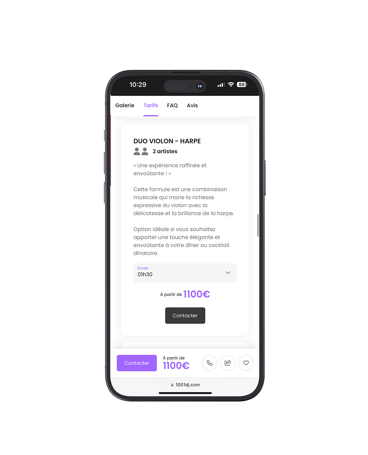 Vous pouvez proposer des prestations musicales variées : concerts, DJ sets, animation musicale pour événements, etc. Vous avez également la possibilité de créer des offres et formules packagées, détaillant la durée, le tarif et la composition de votre prestation.